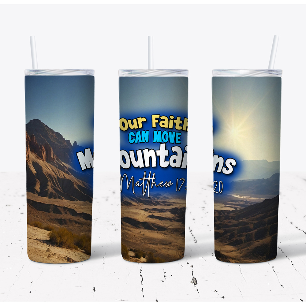 Let your faith be unshakable with the Our Faith Can Move Mountains Stainless Steel Tumbler. Inspired by the powerful words of Matthew 17:20, “Truly I tell you, if you have faith as small as a mustard seed, you can say to this mountain, ‘Move from here to there,’ and it will move. Nothing will be impossible for you,” this tumbler serves as a daily reminder of God’s limitless power working through your faith.